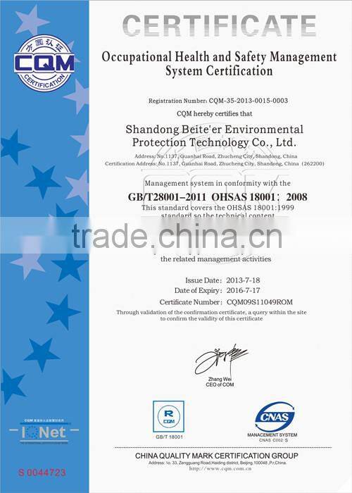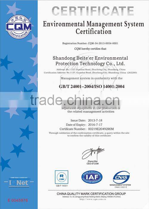The company was awarded of "China Patent Shandong Star Enterprise" "Provincial High-tech Enterprise" "The State Science and Technology Commission on Environmental Protection Project Technology Promotion Supporting Institution" "Quality Service Prestige AAA Enterprise" " Abiding by Contracts and Keeping Promises Enterprise" and other rewards. Besides, the company has got the ISO9000 Quality Man"gement System Certification, and the brand "BEITEER" was named "China Famous Brand".